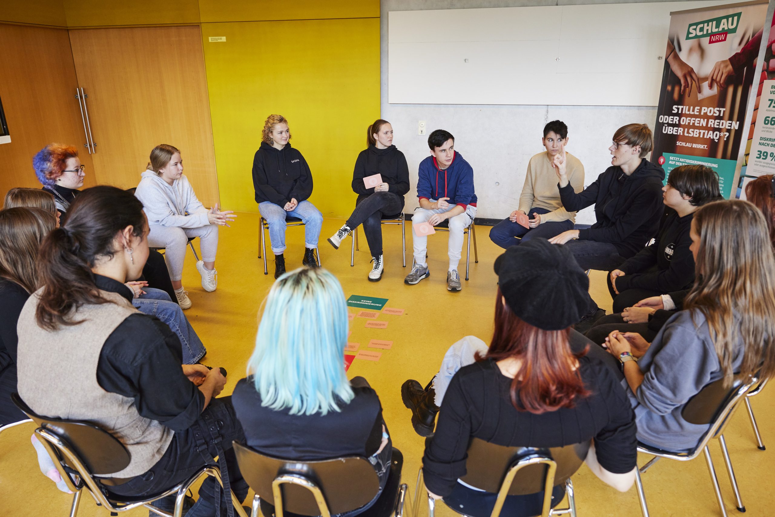das Engagement für mehr Akzeptanz und Respekt und trägt aktiv dazu bei, eine sichere und inklusive Atmosphäre an Schulen zu schaffen, in der jede*r, unabhängig von Geschlecht und sexueller Orientierung, selbstbestimmt und ohne Angst leben kann. Jugendliche bekommen die Möglichkeit, queere Menschen kennenzulernen und mit ihnen ins Gespräch zu kommen, wodurch sie ihre Vorurteile und/oder Ängste abbauen können.
