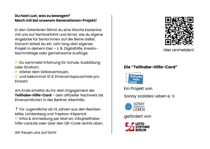 Die „Teilhabe-Hilfe-Card“ ist der Ausweis für ehrenamtliche Jugendliche in der Berliner Altenhilfe. Um die „Teilhabe-Hilfe-Card“ zu erhalten, absolvieren Jugendliche ab 14 Jahren eine 42-stündige Schulung. Diese befähigt sie, sich ehrenamtlich in Einrichtungen der Altenhilfe zu engagieren. Im Anschluss leiten die Jugendlichen regelmäßig eigene Angebote aus den Bereichen digitale, kulturelle oder soziale Teilhabe an. Über einen Zeitraum von zwölf Monaten werden sie dabei von pädagogischen Fachkräften begleitet. Den Abschluss bildet eine feierliche Übergabe der „Teilhabe-Hilfe-Card“.